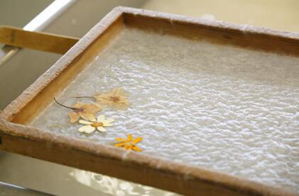 和紙由名為“流漉”的傳統(tǒng)技術制造而成。將名為“漉舟”的木箱泡在水槽里,通過前后左右不斷晃動而制造出厚度均勻的紙。這種纖維復雜纏繞而成的和紙,無論是縱向還是橫向都不易破損,柔韌度高,薄而結(jié)實。