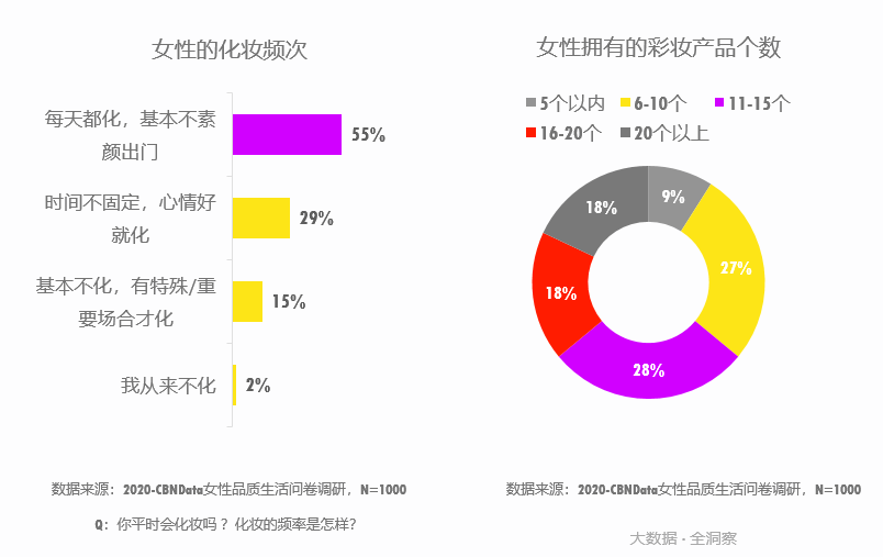 CBNData《報(bào)告》顯示,越來越多的女性開始關(guān)注對(duì)自己外在形象的話語權(quán),近年來彩妝消費(fèi)需求強(qiáng)勁。55%的女性每天化妝,64%的女性擁有10件以上的化妝品。
