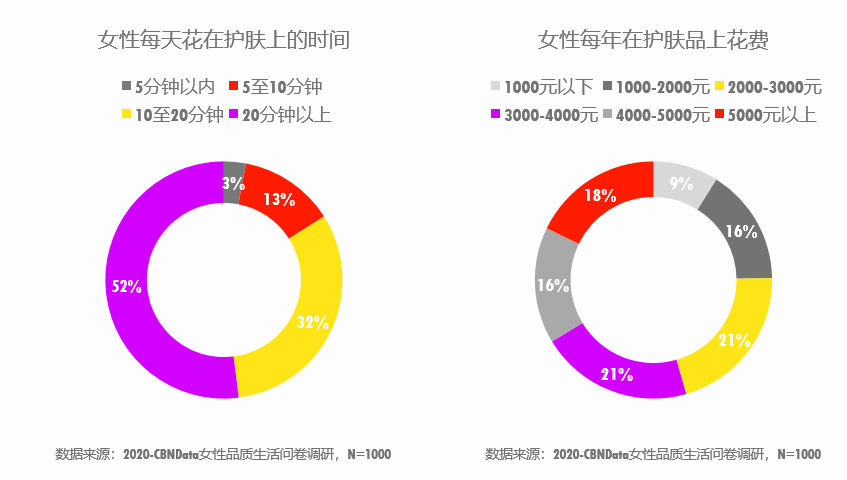 CBNData《報(bào)告》指出,近兩年內(nèi),護(hù)膚、口服美容等與顏值相關(guān)的品類帶動(dòng)萬億級(jí)的消費(fèi)增長,其中洗臉儀、按摩儀、蒸臉儀等高科技美容儀備受青睞。55%的女性每年護(hù)膚品花費(fèi)超過3000元,超過半數(shù)的女性每天花在護(hù)膚上的時(shí)間超過20分鐘。