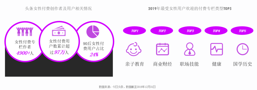 同時(shí),越來越多的女性讀者開始愿意為優(yōu)質(zhì)內(nèi)容買單。以今日頭條為例,截至2019年底,全年平臺(tái)女性付費(fèi)專欄作者近5000人,女性付費(fèi)用戶有近百萬,其中90后占24%。在所有的付費(fèi)專欄里,親子教育、商業(yè)財(cái)經(jīng)和職場技能類專欄最受女性用戶喜歡。