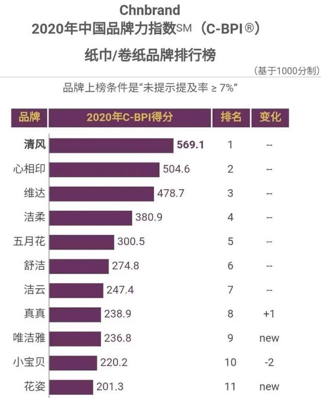 清風(fēng)能夠連續(xù)兩年榮獲“2020年C-BPI中國品牌榜紙巾/卷紙類第一品牌*”,同公司品牌真真和唯潔雅也成功躋身前十,這不僅證明產(chǎn)品品質(zhì)得到認(rèn)可,更意味著品牌獲得廣大消費(fèi)者的喜愛與支持。