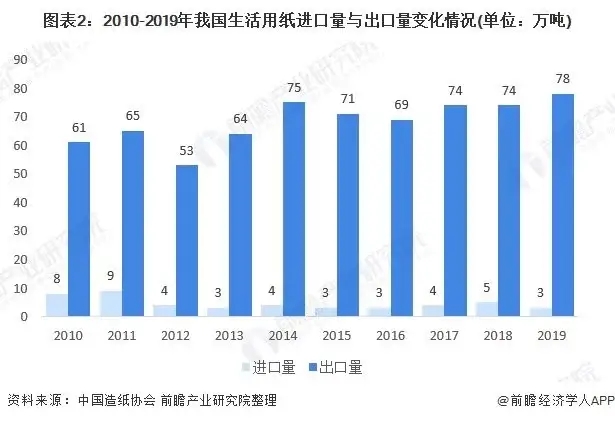 2010-2019年,我國(guó)生活用紙進(jìn)口數(shù)量較少,出口數(shù)量整體上呈現(xiàn)波動(dòng)增長(zhǎng)態(tài)勢(shì),出口量遠(yuǎn)高于進(jìn)口量。2019年,我國(guó)生活用紙進(jìn)口量為3萬噸,較2018年減少了2萬噸;出口量實(shí)現(xiàn)78萬噸,較2018年增長(zhǎng)了4萬噸。