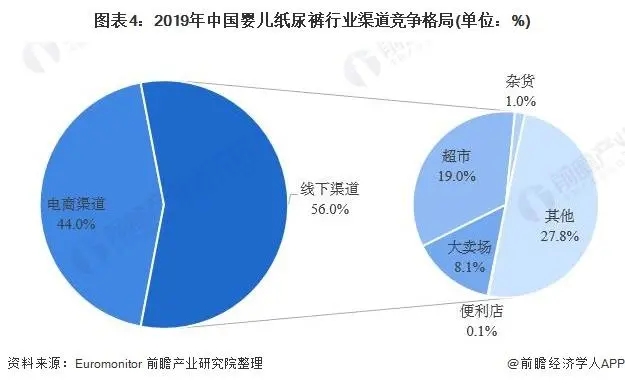 隨著互聯(lián)網(wǎng)以及網(wǎng)購(gòu)的流行,電商渠道的銷售占比不斷提升,嬰兒紙尿褲電商渠道銷售占比從2010年的4.8%迅速增長(zhǎng)至2019年的44%,而以超市、大賣場(chǎng)等為代表的線下渠道銷售額占比從2010年的95.2%減少至2019年的56%。
