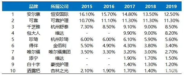 在企業(yè)數(shù)量上,2018年統(tǒng)計在冊的成人失禁用品生產(chǎn)企業(yè)有448家。本土廠商包括杭州可靠、恒安國際、豪悅護(hù)理等,外資廠商包括金佰利、尤妮佳等。目前成人失禁用品以國內(nèi)品牌為主,2019年國內(nèi)品牌恒安國際安爾康、杭州可靠、杭州舒泰千芝雅市占率分別為12.5%、11.3%、8.5%,占據(jù)前三。