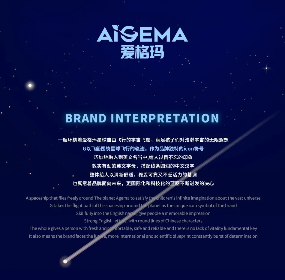 有故事的LOGO,飛船+星軌,小小星夢從此開始。愛格瑪星系宇宙,架構起所有關于愛的哲學的童話意義。簡潔內(nèi)趣,帶領品牌踏上愛的新征程。