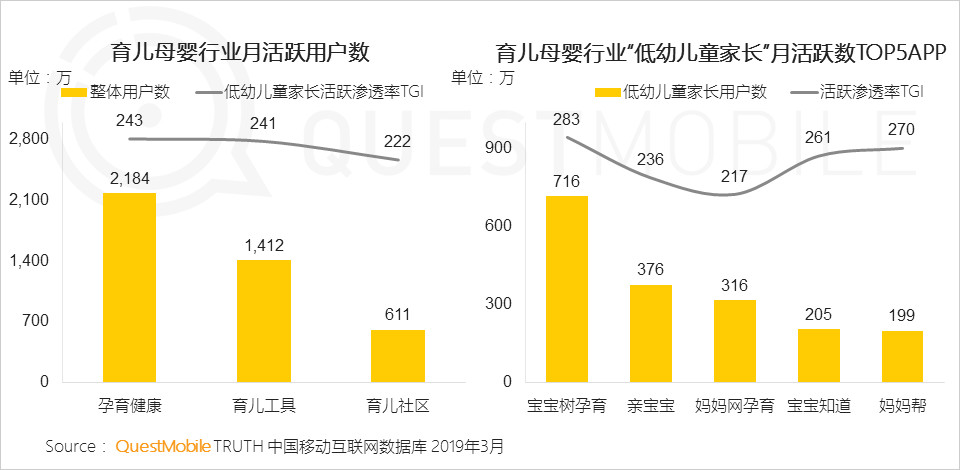 “低幼兒童家長(zhǎng)”(泛指0-6歲家長(zhǎng)人群)人群關(guān)注領(lǐng)域包括在線(xiàn)消費(fèi)、幼兒教育、育兒社區(qū)、親子旅游。2016年“全面二孩”政策實(shí)施以后,中國(guó)新生兒童數(shù)量經(jīng)歷了兩年快速增長(zhǎng)后有所回落,學(xué)齡前兒童數(shù)量維持穩(wěn)定態(tài)勢(shì),但二胎政策帶來(lái)人口利好,低幼經(jīng)濟(jì)價(jià)值凸顯,據(jù)QuestMobile數(shù)據(jù)顯示,目前中國(guó)0-6歲兒童人數(shù)約1億,0-6歲兒童消費(fèi)市場(chǎng)規(guī)模已超1.5萬(wàn)億,“低幼兒童家長(zhǎng)”用戶(hù)規(guī)??焖僭鲩L(zhǎng)已經(jīng)接近2.7億,在中國(guó)家庭中,超八成的家長(zhǎng)每年在孩子的教育方面支出均在5000元以上,“寶媽”是教育決策的主要決策者,也就是說(shuō),每年在那些呱呱哭叫的嬰幼兒的小手里,0-6歲的媽媽們足足攥著“真金白銀”。