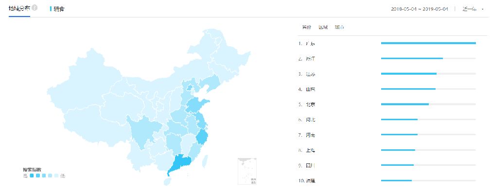 從近一年的百度指數(shù)來看,目前關注輔食最突出的地域是廣州、浙江、江蘇、山東、北京等,可見,當前一二線城市的消費者對輔食的認知教育有所提高,但是低線城市的消費者對寶寶輔食的添加還不重視。