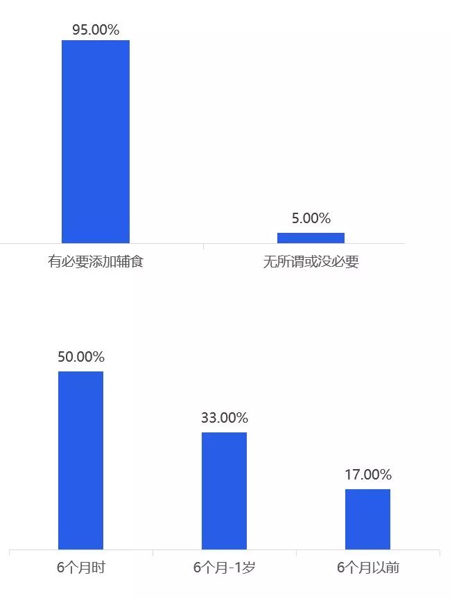 1、幾乎所有的媽媽都認為有必要給寶寶添加輔食,并且有一半的媽媽認為要在6個月時添加,而有32%的媽媽認為在6個月-1歲開始添加,還有16%的人在6個月以前就添加輔食。