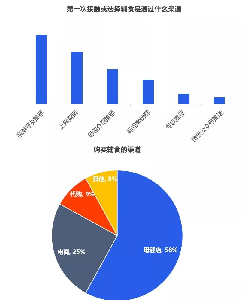 3、互聯(lián)網(wǎng)與社交圈對媽媽的購買決策權的影響力較大,據(jù)調查顯示,媽媽們第一次接觸或選擇輔食大多都是通過親朋好友推薦,上網(wǎng)查詢等。當然消費者在購買嬰兒輔食的渠道選擇上,其實與奶粉并無不同,為了保證產品的質量和安全性,同時也為了可以得到育嬰專家的指導和幫助,消費者更傾向于在專業(yè)的母嬰用品連鎖店或主流電商平臺購買食品。