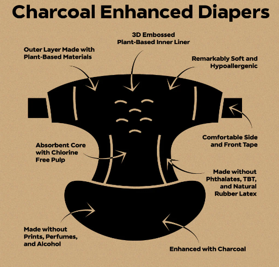 Dyper 推出了木炭增強紙尿褲,其黑色頂片注入了 3% 的竹炭,竹炭以其過濾和除臭特性而聞名。