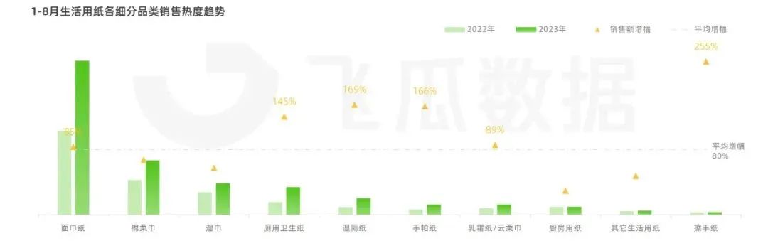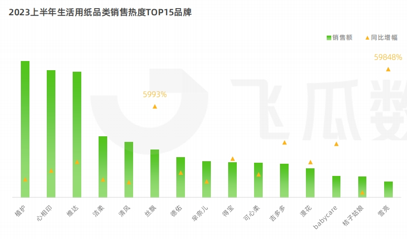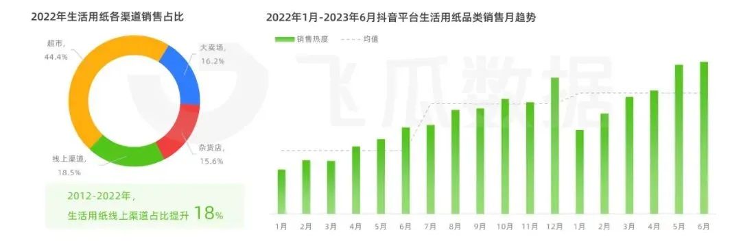 在各大電商平臺中,抖音電商表現(xiàn)出強(qiáng)勁增勢,2023上半年生活用紙的品類銷售熱度較去年同期增長75.4%。