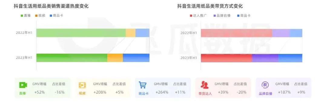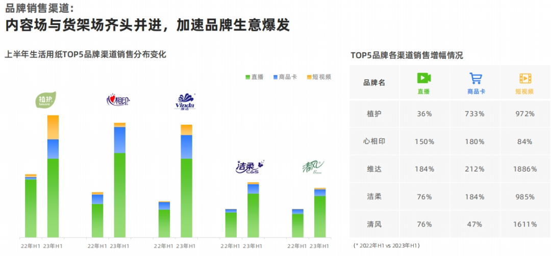 根據(jù)去年生活用紙TOP5品牌渠道銷售增幅變化數(shù)據(jù)顯示,相較于其他渠道方式,直播帶貨銷售額總體上較22年增長額最大,最高可達(dá)至184%,內(nèi)容場與貨架場齊頭并進(jìn),加速品牌生意爆發(fā)。
