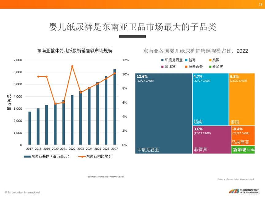 眾多紙尿褲品牌對東南亞市場情有獨鐘背后,是可觀的市場前景。根據(jù)Euromonitor(歐睿信息咨詢)數(shù)據(jù)顯示,2022年東南亞一次性衛(wèi)品市場整體零售額達到了65億美元,其中嬰兒紙尿褲是東南亞衛(wèi)品市場最大的子品類,去年市場規(guī)模超過了40億美元,21-22年同比增長達到將近11%。預計2027年嬰兒紙尿褲市場會超過60億美元。