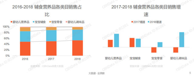 目前輔食營(yíng)養(yǎng)品大致分為嬰幼兒營(yíng)養(yǎng)品、寶寶輔食、寶寶零食、嬰幼兒調(diào)味品四個(gè)子品類(lèi)。從上圖我們不難看出,從2016年—2018年嬰幼兒營(yíng)養(yǎng)品從不足50%提升至50%以上,銷(xiāo)售占比逐年提升,發(fā)展態(tài)勢(shì)一片大好。一方面,“生命早期1000天營(yíng)養(yǎng)健康”在政府層面的確立,更是為嬰兒營(yíng)養(yǎng)品打開(kāi)了市場(chǎng)的大門(mén);另一方面,在優(yōu)生優(yōu)育觀念的影響下,孕育下一代成為每個(gè)家庭的頭等大事,嬰幼兒營(yíng)養(yǎng)品的市場(chǎng)占比與熱度日益提升。